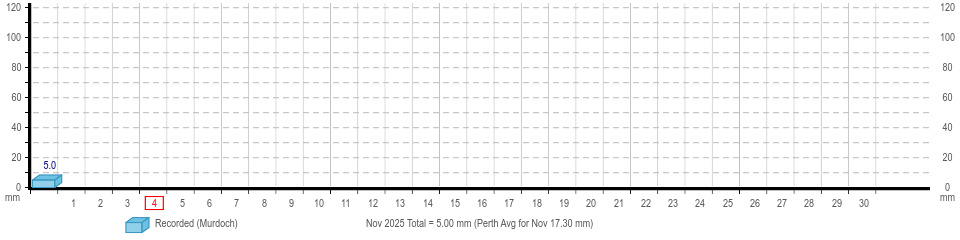 The Murdoch Weather Station has been collecting data since 24 May 1998. Annual, Monthly and Daily rainfall graphs can be viewed on this page by clicking the appropriate tab. Each panel has its own set of controls to set the From (start) and To (end) dates for the graphs required. All start date selectors allow the full range of dates to be selected, from 24 May 1998 to the day before the date of the latest sensor readings. End date selectors have restricted date ranges depending on which graph they control (see below for more details). Note that due to occasional technical problems, such as power and equipment failures, you may find some data is missing.